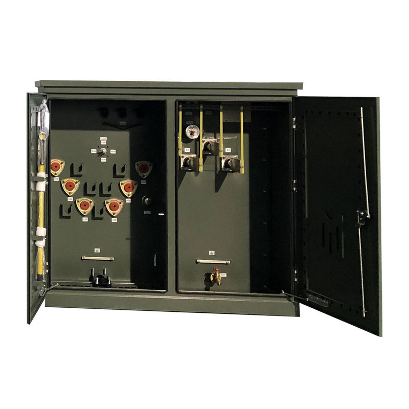 2) 3 Phase Pad-montierte Transformator adoptiert Ellenbogen Steckeranschluss. Es kann sehr praktisch für den Anschluss von Hochspannungseingangskabeln sein. Als Lastschalter im Notfall verwendet.Es kann unter Strom angeschlossen und abgeschaltet werden..